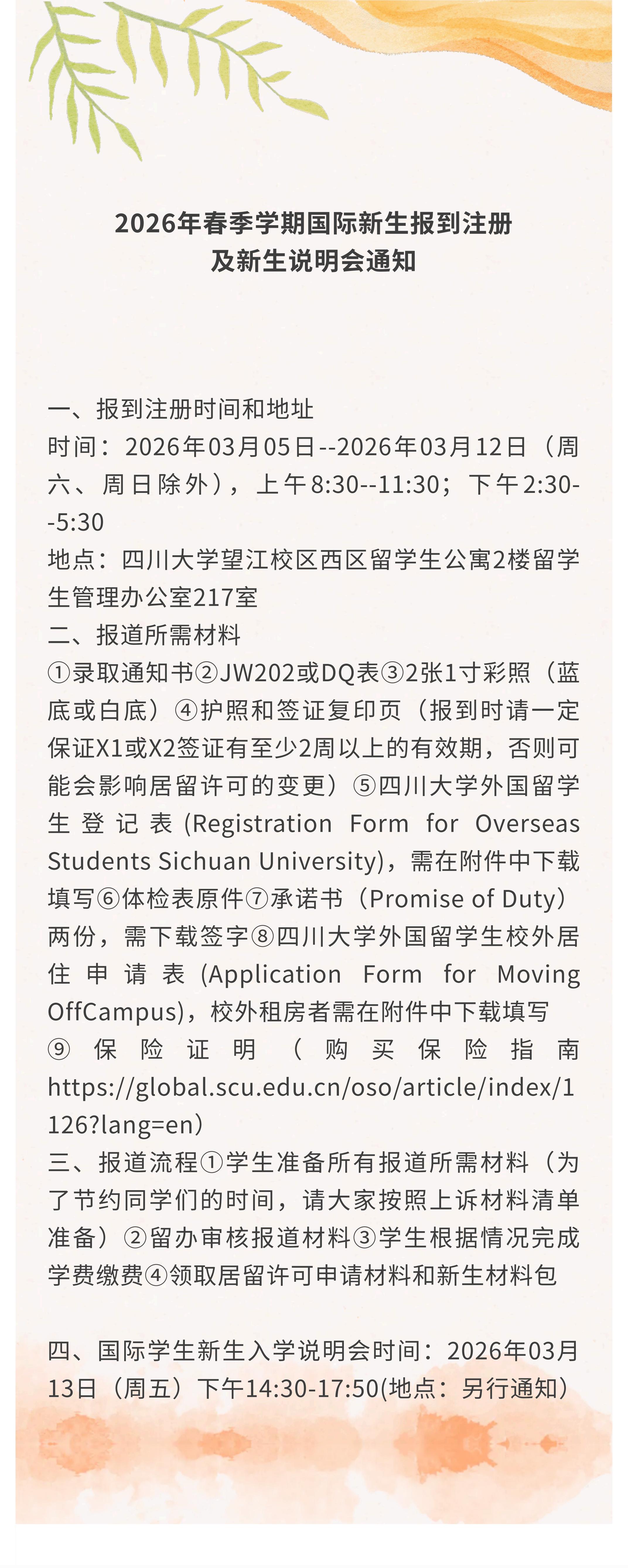 2026年春季学期国际新生报到注册及新生说明会通知