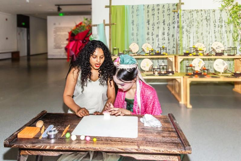 随后,大家走进展厅负一层中庭,欣赏来自射洪市第六小学校“清风茶社”的28名小学生演绎千年茶文化。通过小茶人们以盖碗茶艺表演,巧妙融入廉洁文化,在一杯清茶中诠释茶廉之道。同时,活化演绎了宋代文人四雅——“点茶、绘画、插花、焚香”,结合舞蹈、武术动作展示了川渝茶馆文化中的代表——长嘴壶茶艺,现场又演示了宋代团茶从拣芽、蒸芽到研膏造茶的完整制作工艺流程,最后以二十四节气为主题,制作出充满传统文化韵味的茶果并讲解了茶树、茶叶知识。小茶人们的精彩表演深深吸引了留学生们,他们积极参与到各项体验活动中,和小茶人们学习点茶、制饼茶、茶果等。来自斯里兰卡的留学生韦丝密表示:“之前只知道中国茶很有名,今天亲身体验后,才发现里面有这么多学问和乐趣。回国后,我要把今天学到的茶文化分享给身边的人,让更多人了解中国的这项优秀非遗。” 茶作为中华文化的重要符号,亦是中外交流的“通用语言”,而沉浸式的制茶体验则对促进茶文化的国际传播有极为积极的意义。