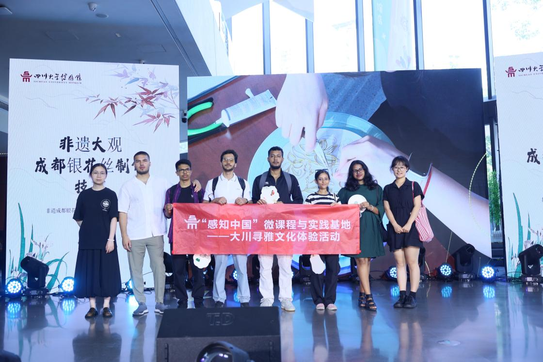 活动开始,国际学生们在博物馆老师的引导下齐聚一层大厅舞台,聆听成都银花丝镶嵌工艺非遗传承人谭清华老师介绍银花丝工艺的发展历史与艺术特色,并近距离观赏了精妙绝伦的成都银花丝制作技艺,深刻感受到“匠心传承”在这一非遗工艺中的生动体现。