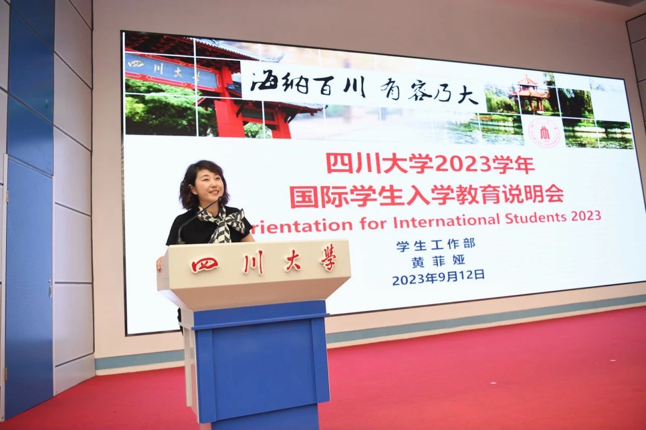 随后,党委学生工作部(处)副部(处)长黄菲娅发表了讲话,详细介绍了学校的文化、体育、社会实践、创新创业等活动,并表示文化无国界,同学们要积极参加文体活动,展示本国文化特色,美美与共。同时,希望各位国际学生们立学川大、志存高远。