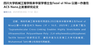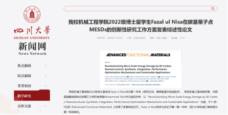 同为2022级的博士留学生Fazal ul Nisa,聚焦MEMS储能/传感器件性能提升机制这一方向努力探索,凭借对科研的执着努力精神,已在《Materials Today》、《Coordination Chemistry Reviews》、《ACS Nano》、《Advanced Functional Materials》、《Nano-Micro Letters》、《Composites Part B: Engineering》、《Chemical Engineering Journal》、《Small》等国际重要期刊上发表SCI学术论文10篇,相关研究进展先后被四川大学官网、四川大学留学生管理办公室及机械工程学院公众号多方关注和报道。