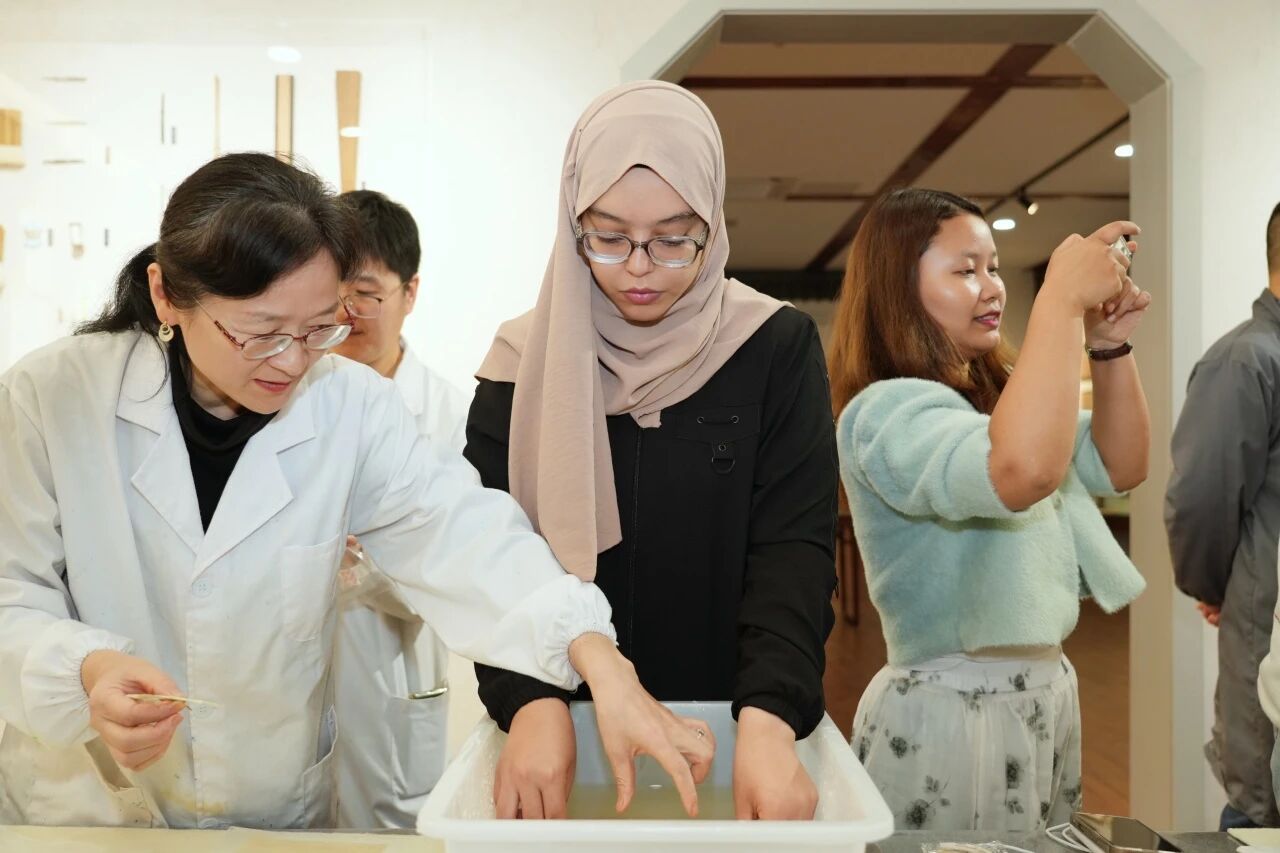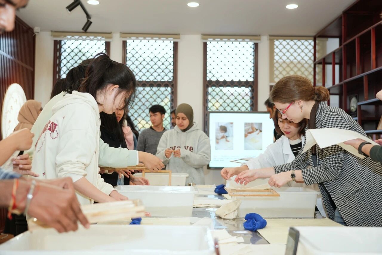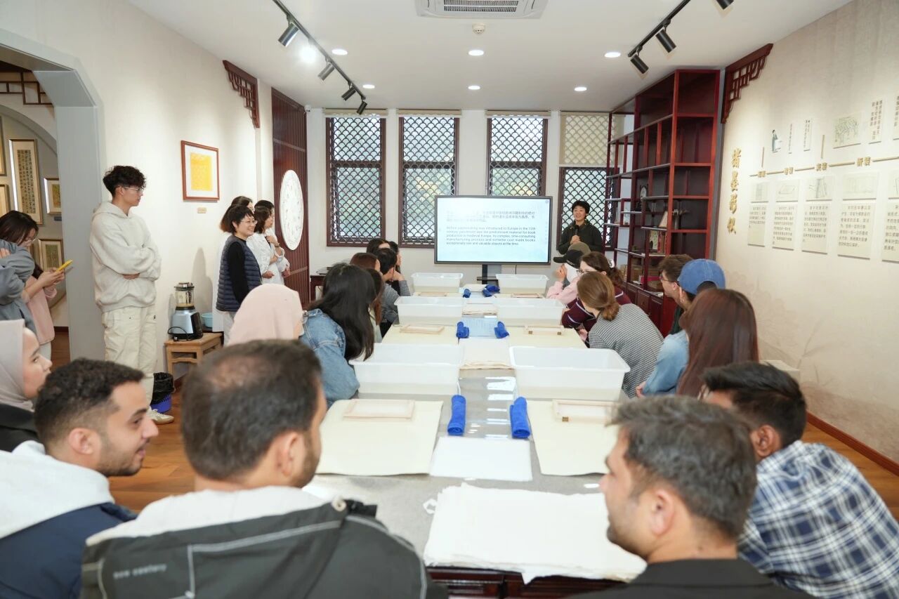 2025年11月7日,时值立冬,寒意初临,四川大学典籍馆内却暖意融融。四川大学2025年“留传经典・蜀韵川大”国际学生特色文化体验项目之“匠心传承:感受指尖上的中国”在此圆满举行。活动由留学生管理办公室资助立项,四川大学图书馆主办,来自东南亚、中东、欧洲等地的20名四川大学留学生齐聚一堂,在图书馆老师的带领下,亲身感受了中国古代“四大发明”之一 ——造纸术的独特魅力。