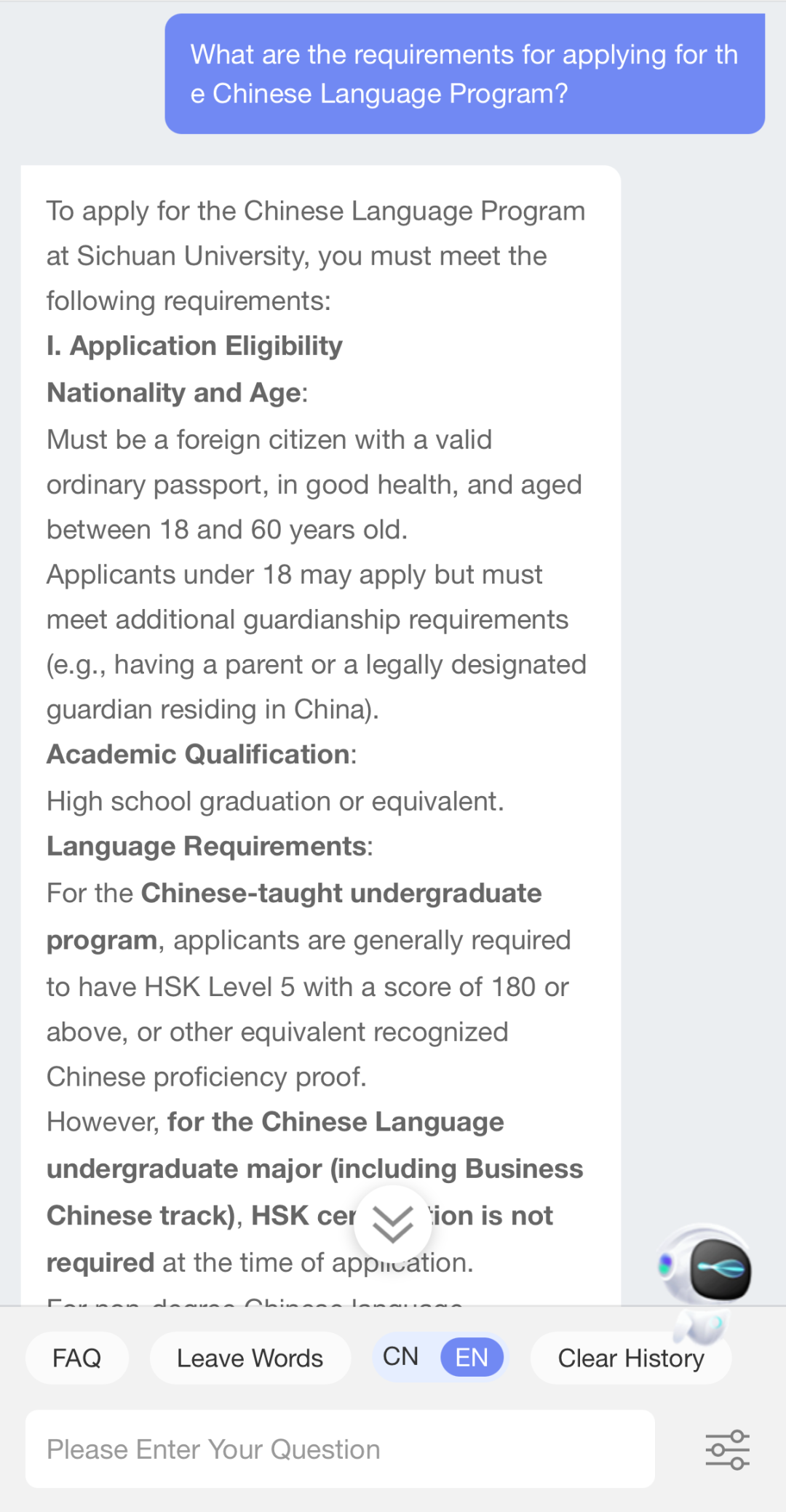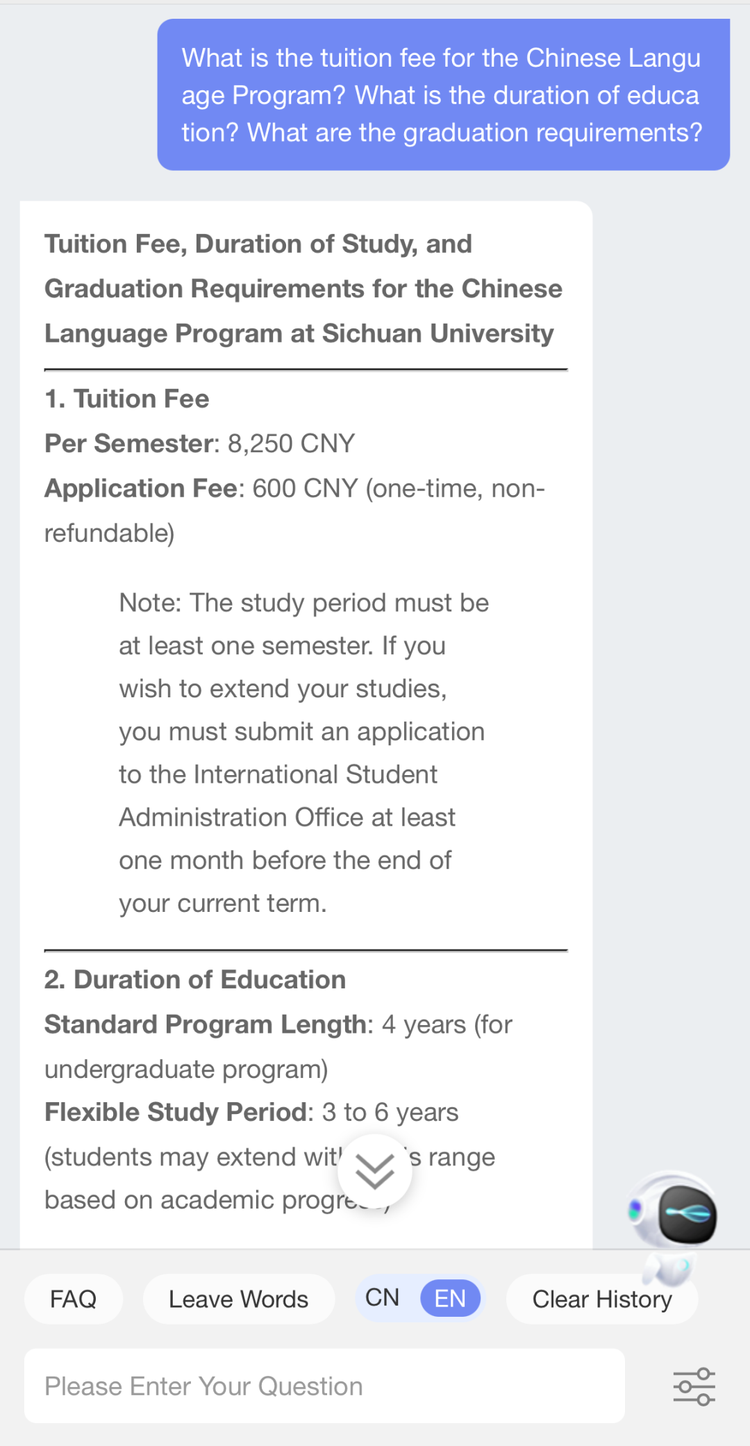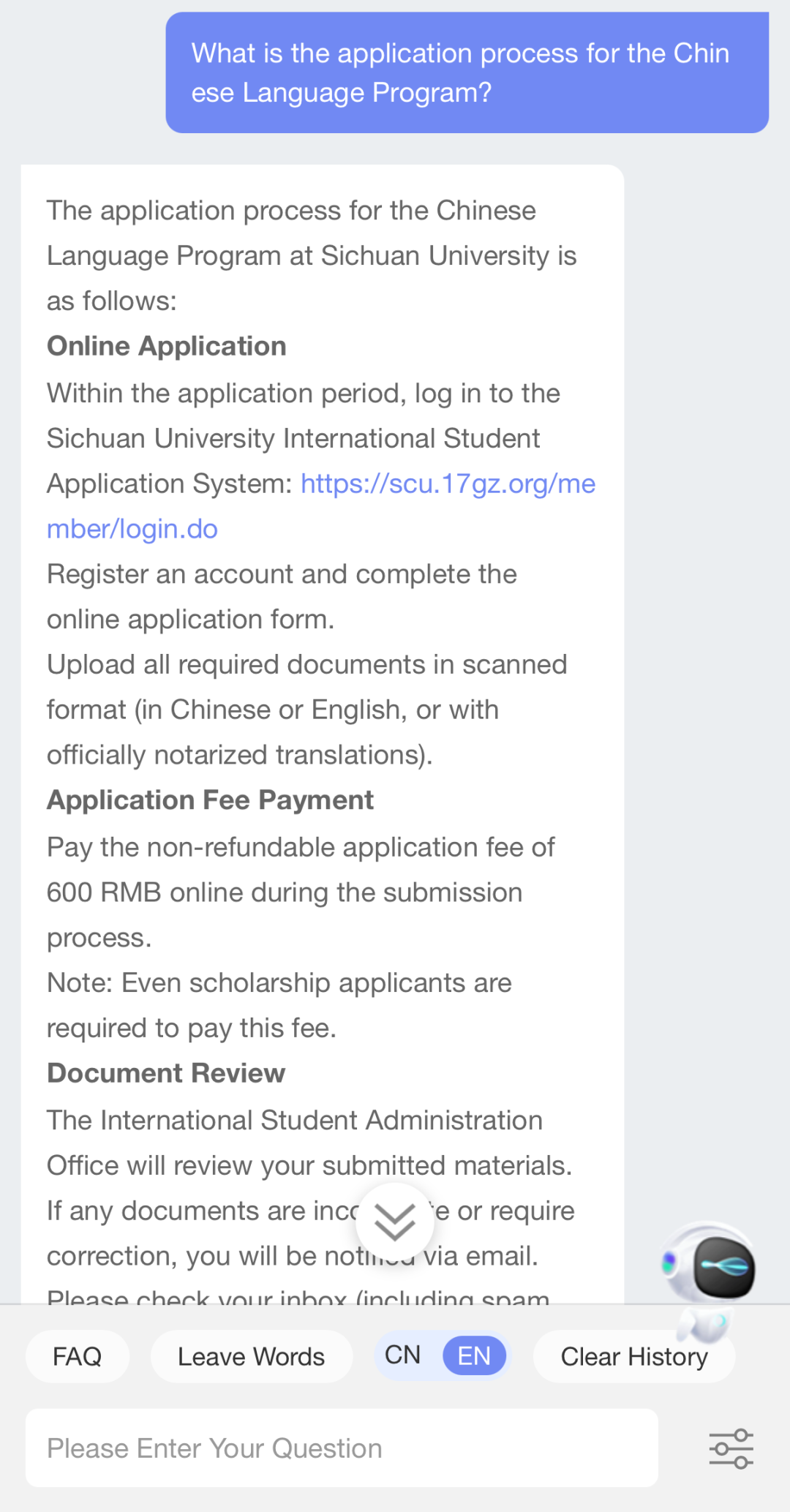 Authoritative and Timely Information: All responses are based on the latest official policies and information released by the Sichuan University International Student Office, ensuring the information you obtain is authentic, reliable, and up-to-date.