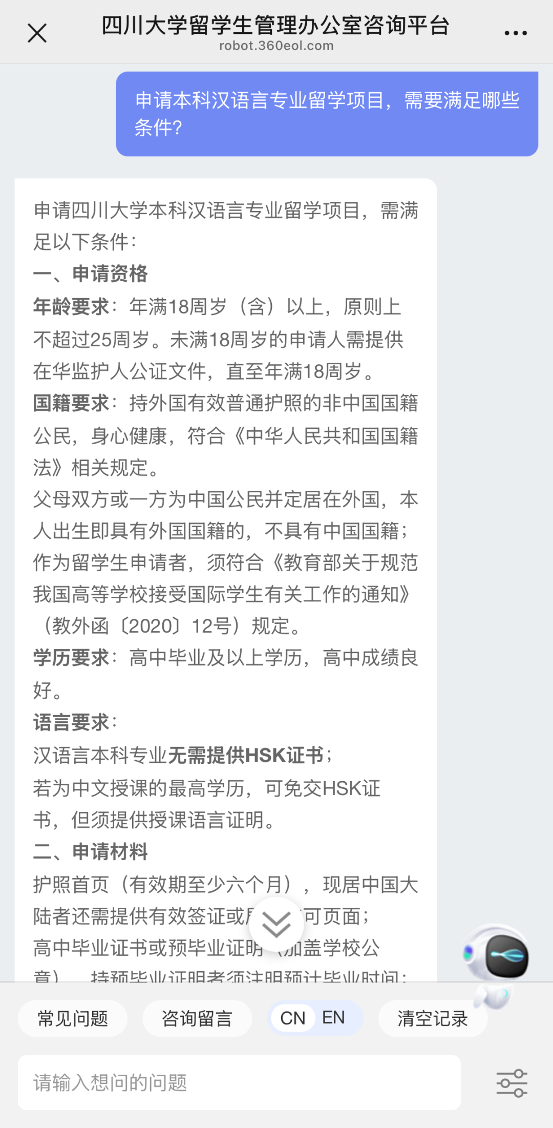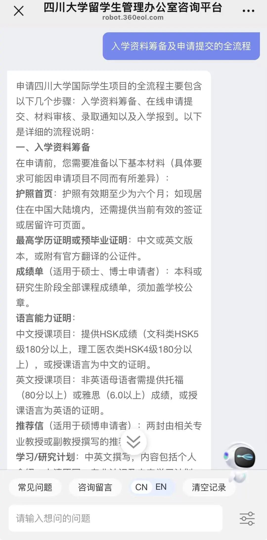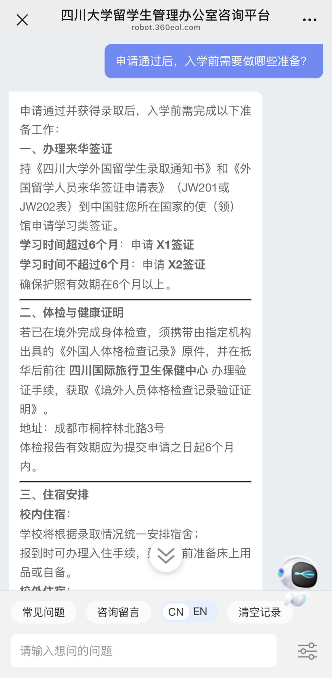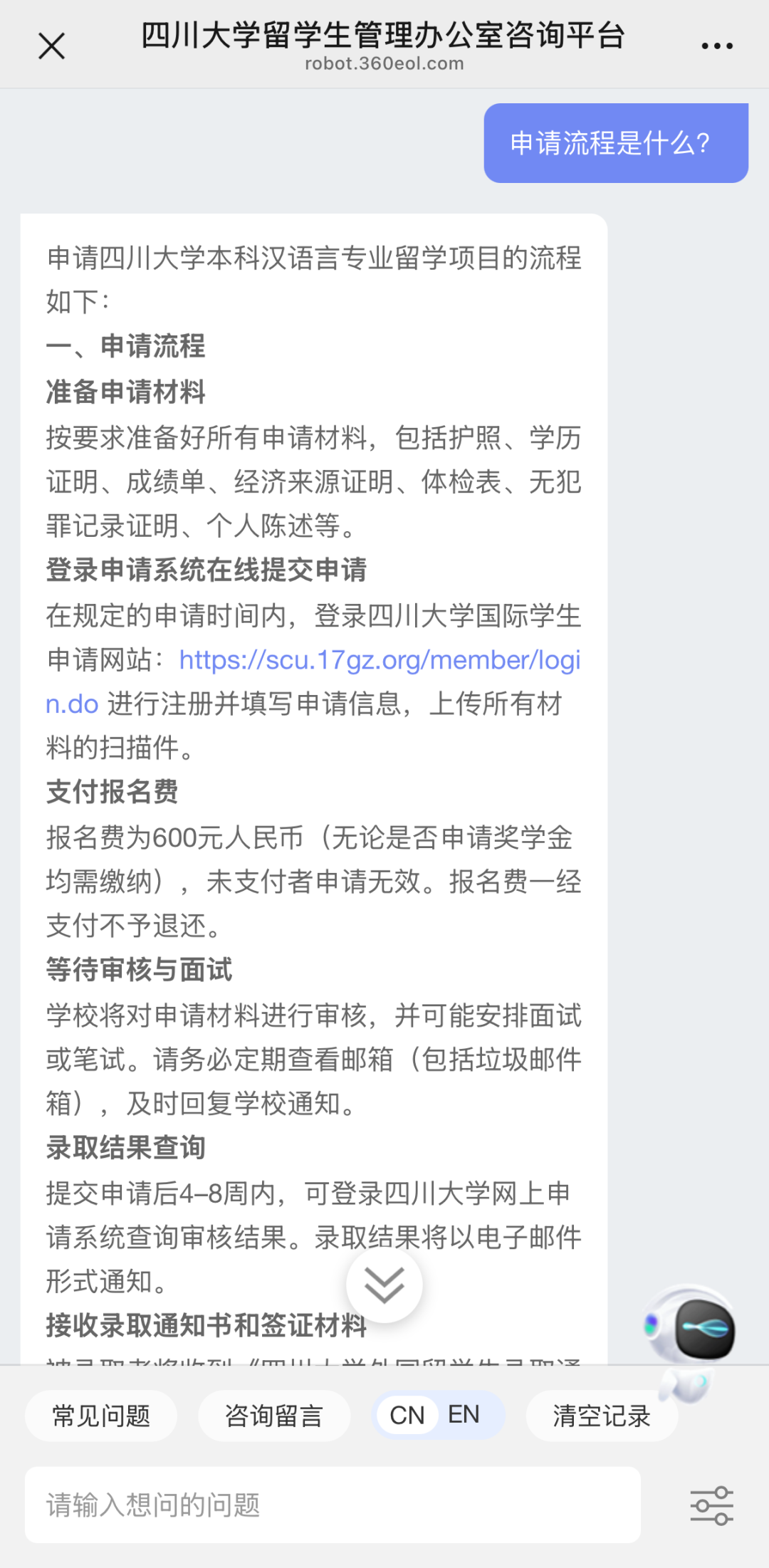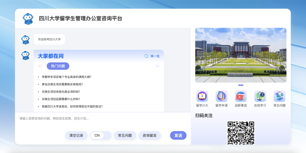 这是四川大学专为留学生打造的一站式智能咨询助手。它全面学习了川大留学生招生、申请、入学及校园生活等方面的官方权威信息,帮助学生随时获取可靠的答疑与指导。
