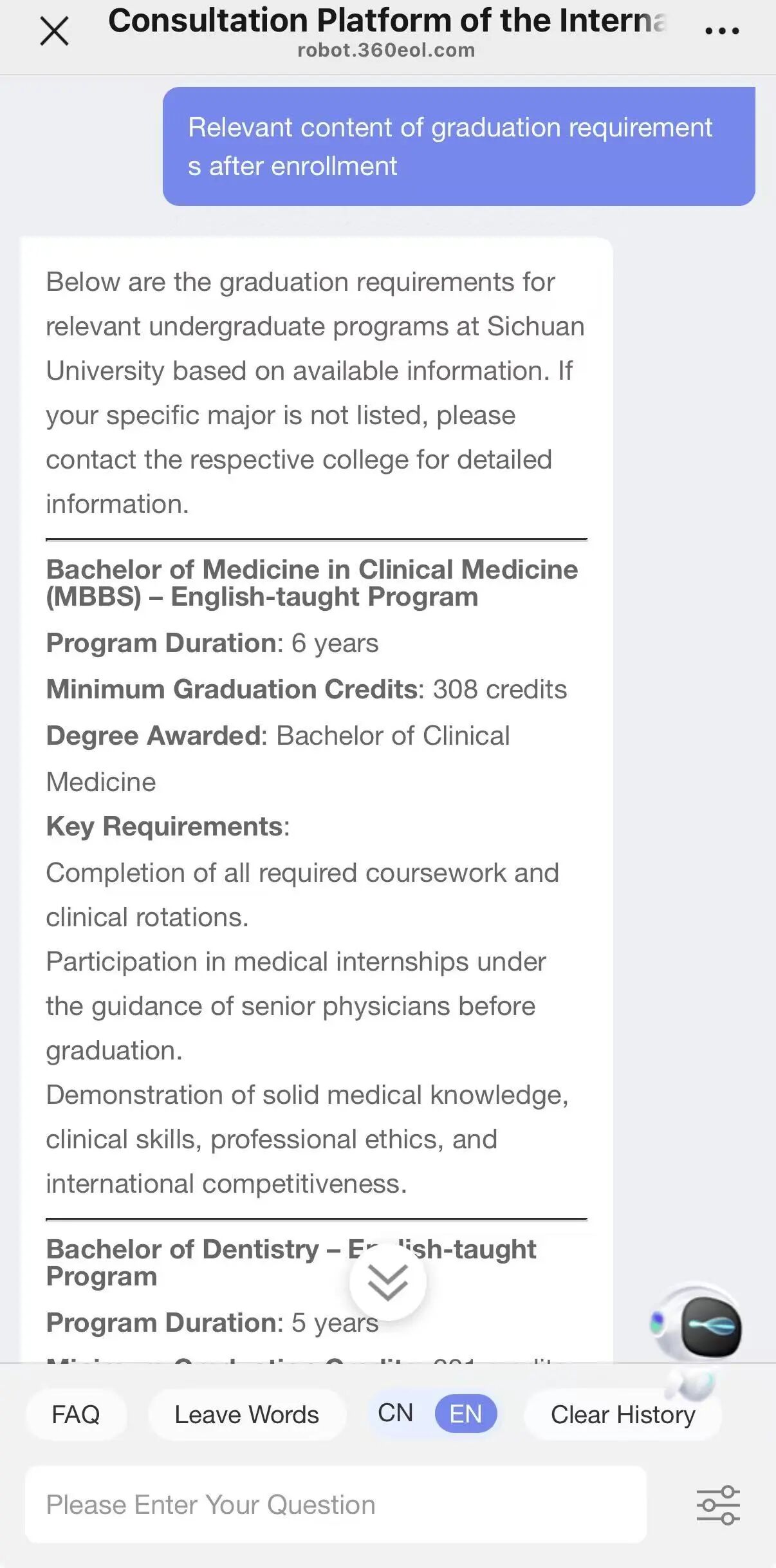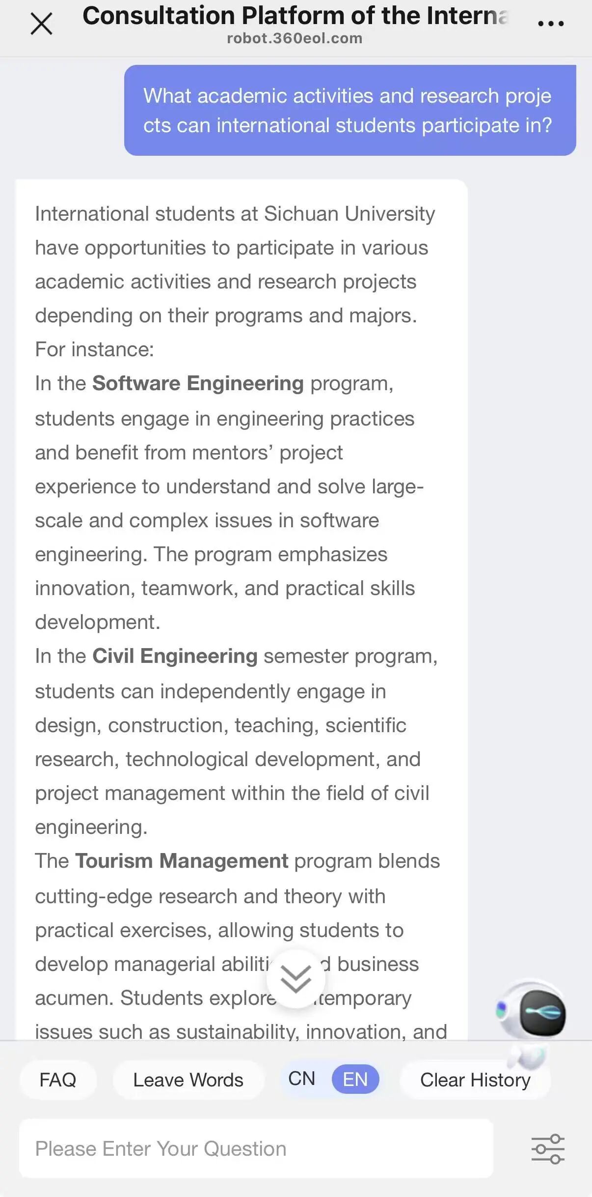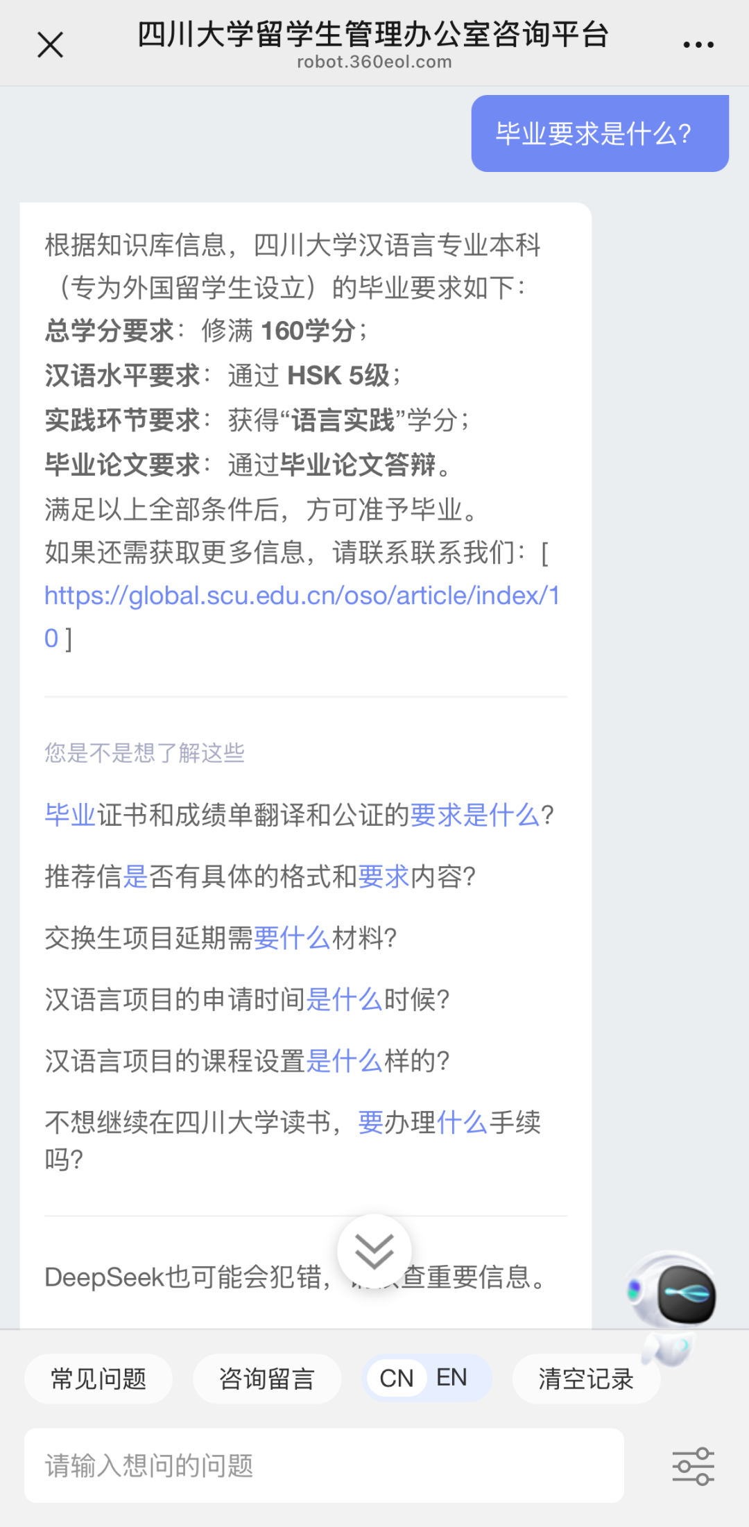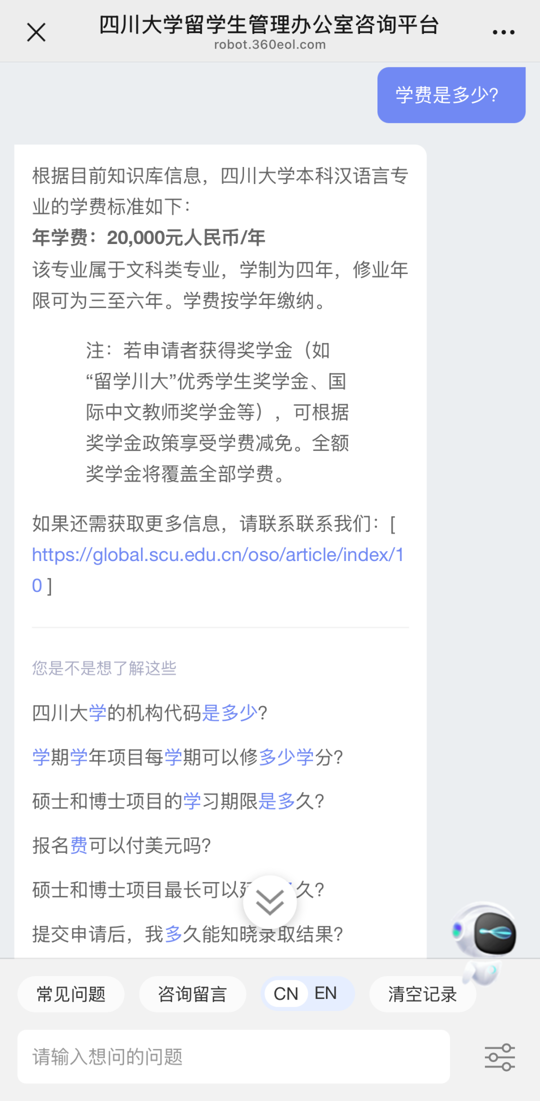 这是四川大学专为留学生打造的一站式智能咨询助手。它全面学习了川大留学生招生、申请、入学及校园生活等方面的官方权威信息,帮助学生随时获取可靠的答疑与指导。