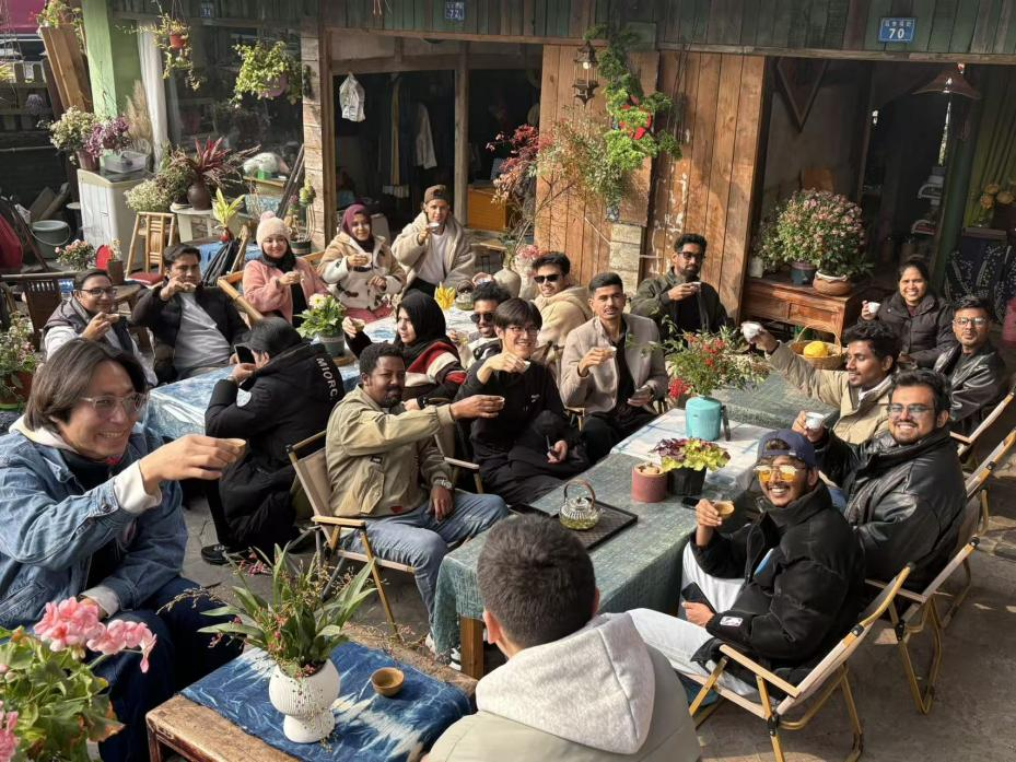 2025年12月17日,师生们前往成都市双流区彭镇进行深度探访。彭镇完整保存了川西民居的原始风貌和传统社区的生活节奏,是体验原生中国乡土文化的珍贵样本。留学生们重点参观了被誉为“镇街之宝”的观音阁老茶馆。这座拥有百余年历史的老茶馆,因其最大限度地保留了建筑原貌与持续不断的社区功能,于2023年荣获联合国教科文组织亚太地区文化遗产保护奖优秀奖。在茶馆内,留学生们体验了传统的“老虎灶”烧水、盖碗茶冲泡技艺,并与当地茶客亲切交流,深刻理解了文化遗产在当代社会中的生命力和凝聚力。