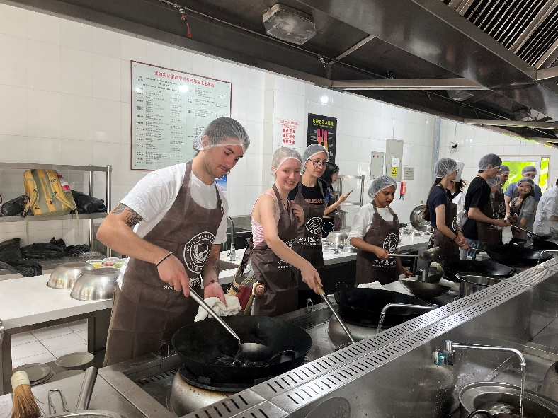 随后,留学生同学们进入了厨房,戴起厨师帽,在主厨们的指导下完成了清洗餐具、火候控制与风味调配的全流程操作。尽管仍然存在一些操作失误,但通过大师们亲切的指导,同学们最终还是顺利完成了本小组的菜品。品尝着自己亲手做的宫保鸡丁与麻婆豆腐,大家纷纷露出了欣喜的笑容,对“宫保”的由来有了更深刻的了解,对麻婆豆腐里花椒的“麻”有了更独特的文化体验,也真正地体会到了大师专题讲座里说的中国饮食“万变不离其宗”。