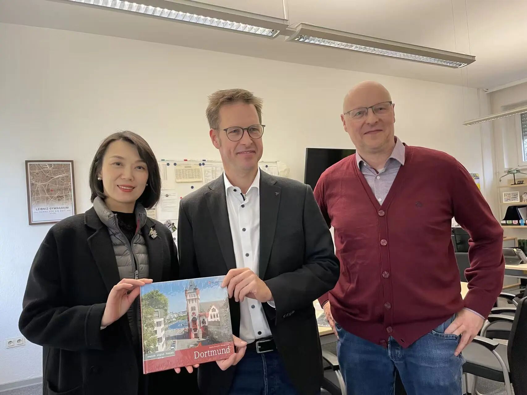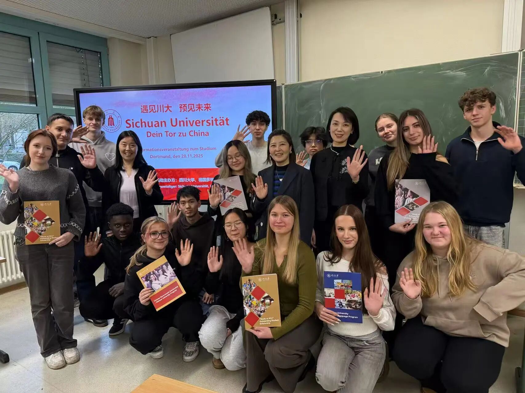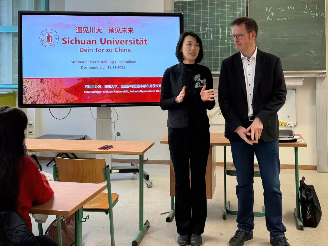 在多特蒙德市莱布尼茨文理中学,访问团为高一、高二中文学习班学生举办2场专场宣讲,结合学生特点介绍川大优势专业、本科英文授课专业及中文项目。现场互动热烈,学生围绕课外活动、入学中文要求、就业前景等提问,留办老师逐一解答,消除其申请顾虑。该校校长Dr.Draxler高度评价此次宣讲,表示将推荐优秀学生申请川大,并表达建立长期稳定合作的意愿。